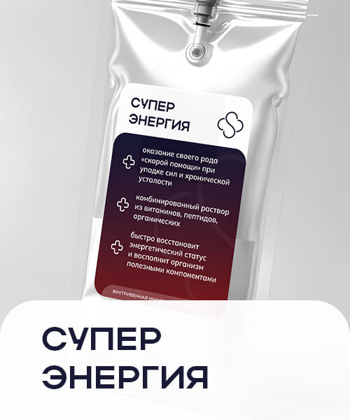 Капельница «Супер энергия» – уникальный коктейль, разработанный для восстановления внутреннего равновесия и повышения жизненной энергии. Капельница защищает организм от стресса, улучшает настроение и восстанавливает здоровый сон. Если чувствуете усталость, раздражение или бессонницу, этот коктейль станет вашим надежным помощником, даря бодрость и психологическую стабильность. Капельница «Супер энергия» станет отличным стартом в работе над отсутствием сил.